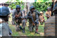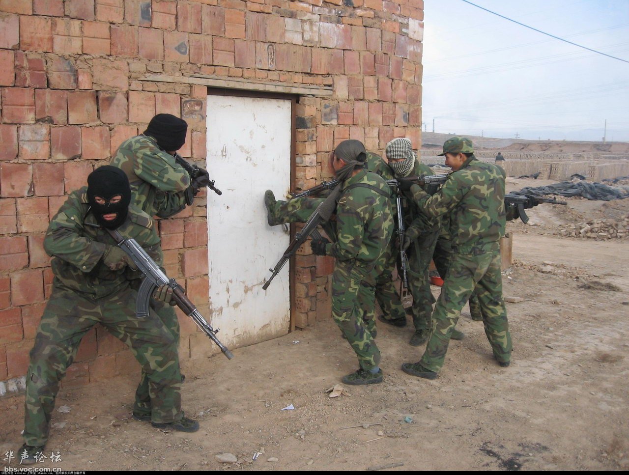 2011年上合组织在新疆的反恐演练中,扮演恐怖分子的士兵,枪口上安装了空包弹助退器