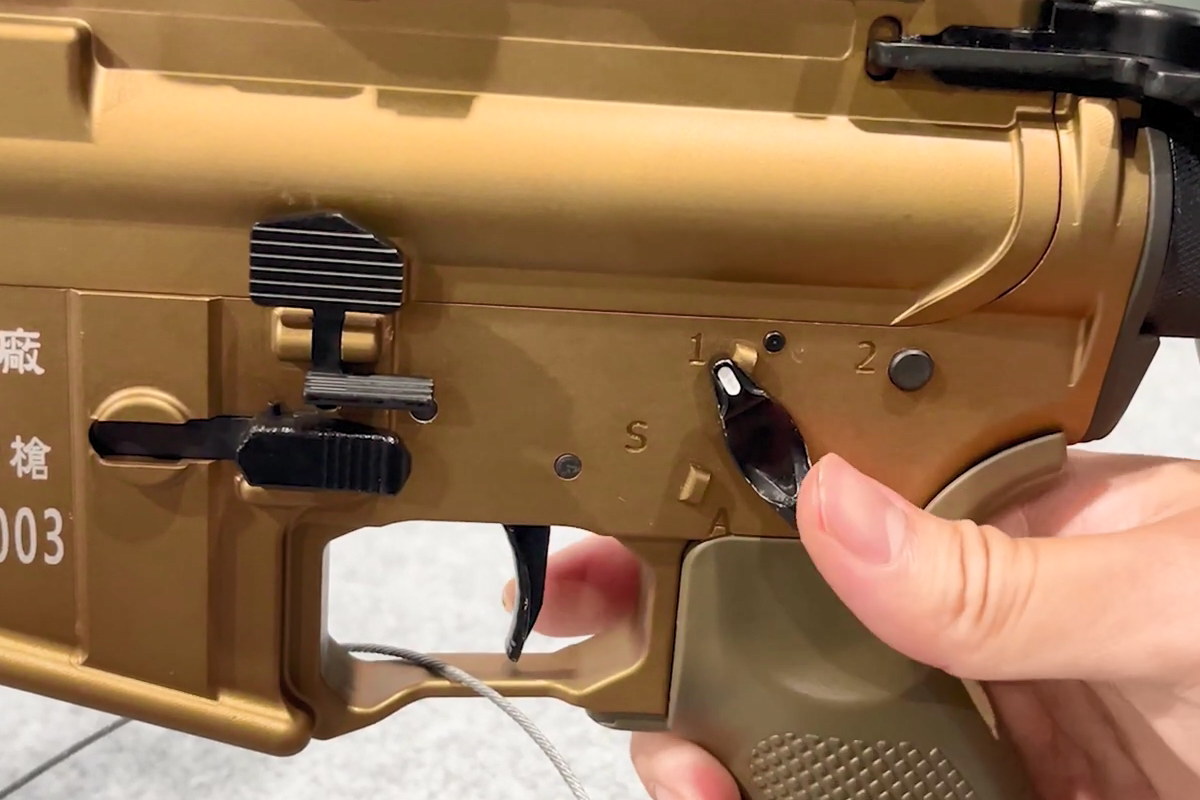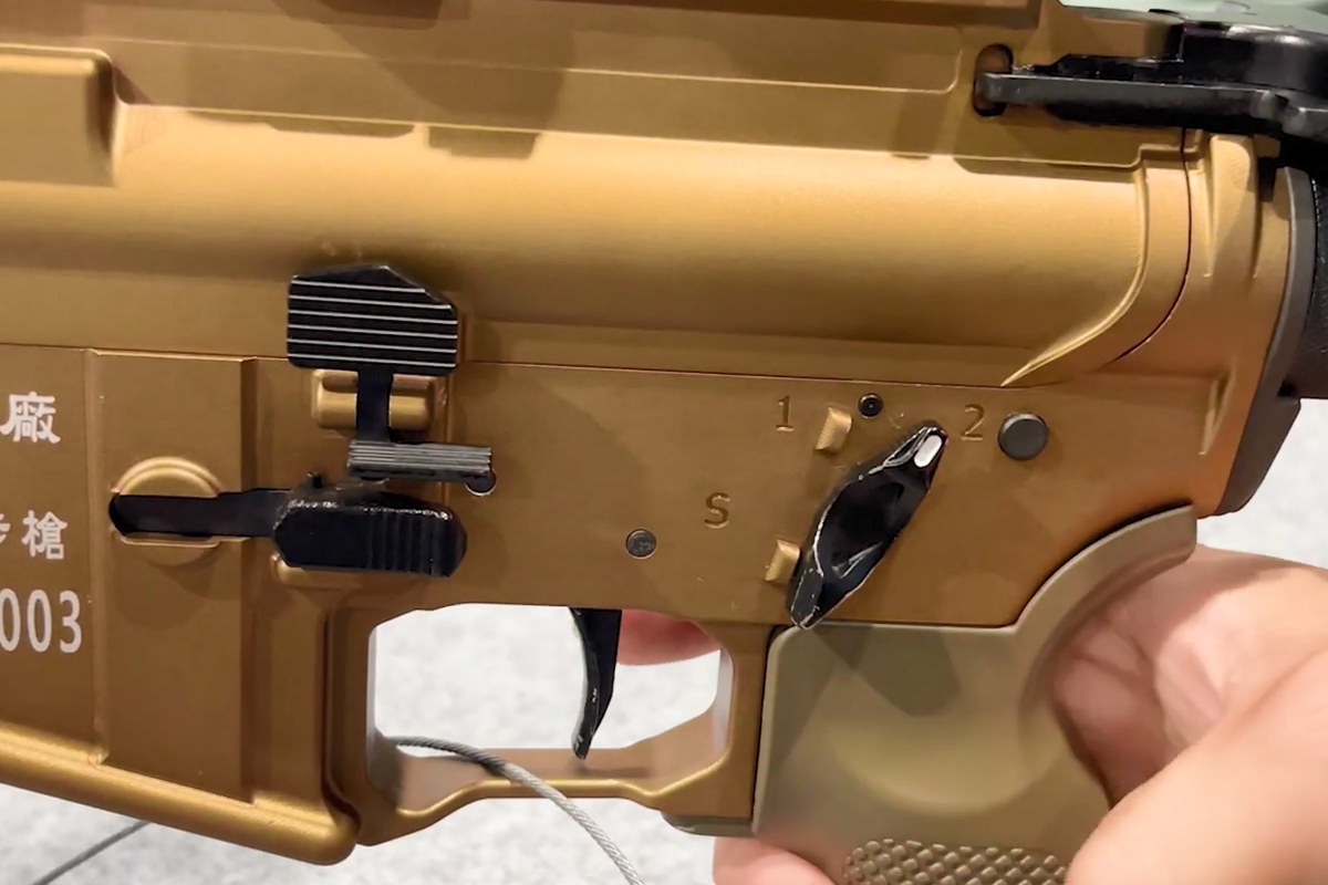 T112的击发机构仍然沿用T65K2、T91的3种射击模式的设计,即可选择半自动、点射和全自动,但有所改进。首先,T112的受控点射模式并非以往T91的3发点射,而是改为2发点射。因此快慢机在点射位置的标记是“2”而非“3”。其次,快慢机的装定顺序与以前的一样仍然是“全自动-保险-半自动-可控点射”,但转动角度比以前的要小。以前的设计一共270度,每转动90度为一档,而T112的转动角度目测大概在220度左右,拇指操作起来会比以前的要便捷一点。