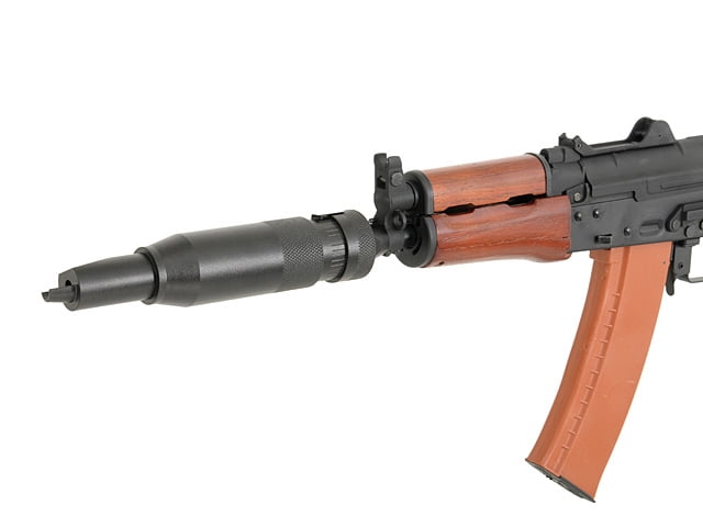 虽然后来AK-74系列也研制了配套的PBS-4消声器及消声弹,但对于亚音速弹来说,弹头重一些杀伤效果更可靠,于是直到后来的车臣战争,仍然可以见到安装PBS-1消声器的AKM系列与普通的AK-74系列甚至最新的9x39mm特种步枪一起并肩作战。