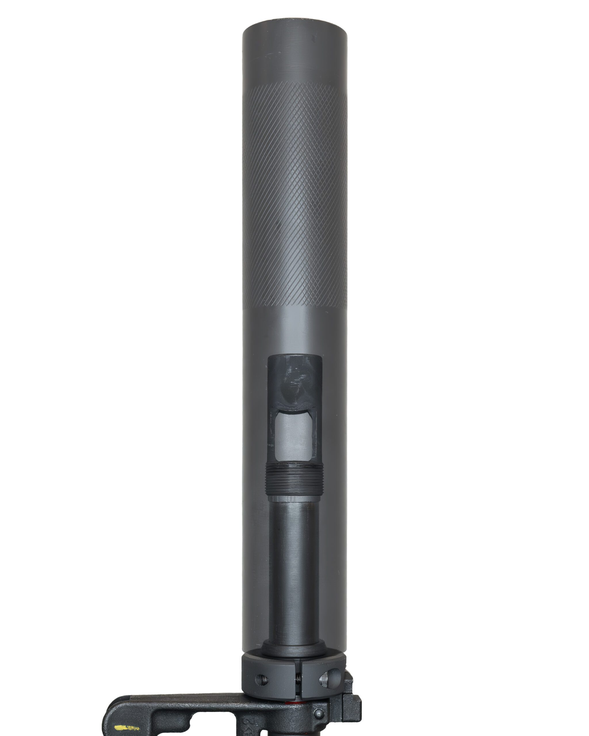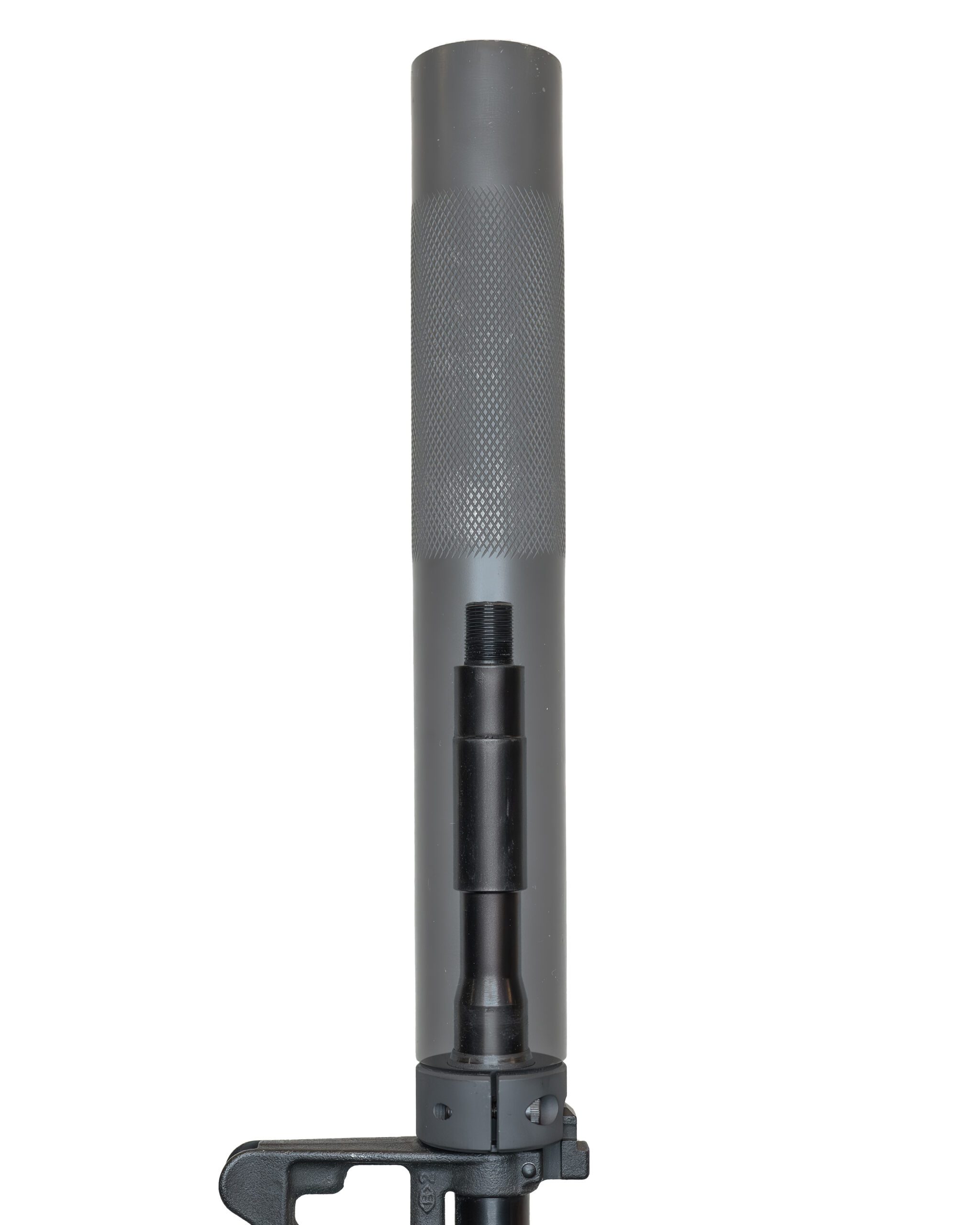 OPS 12th消声器其实上是配MK12 SPR狙击步枪使用的,在不安装消声器时,消焰器外表的螺纹可以旋上一个保护套,消焰器与导气箍之间多出的一个黑色套环前方的锥面就是起第二固定点作用的位置