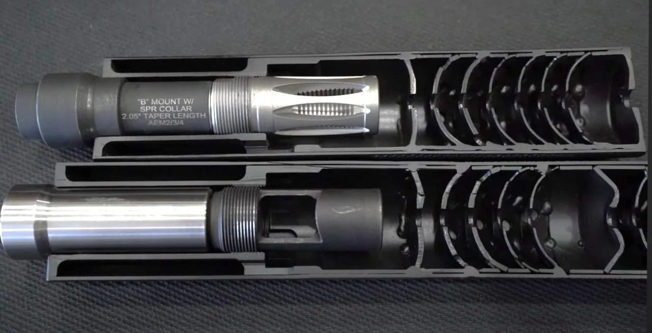 ![]() 艾伦工程公司重新生产的M4-Delta消声器,实际上相当于重新生产的OPS 3RD,因此通过此图可以看出OPS 3RD的安装方式:从图中箭头处左右两侧各拧进一根螺栓就是通过刺刀卡笋来固定的套环 |