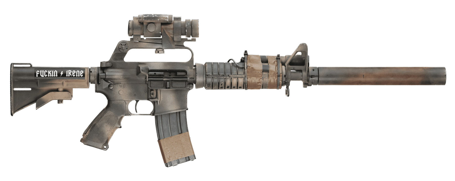 电影《黑鹰坠落》中扮演加里·戈登的演员所使用的道具枪虽然也安装了消声器,但外形与OPS 3RD却大相径庭,另外这支道具枪是用退役的出口型M16A2改装而成的,因此它的外形更像727型,而不是三角洲突击队所使用的723型