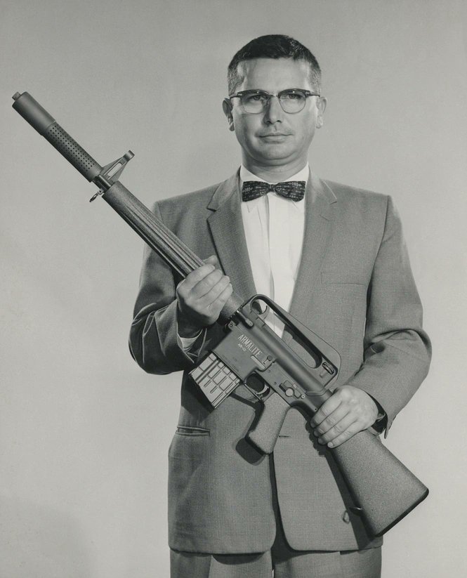 斯通纳与早期AR10原型,枪管为钢铝复合结构,枪口安装有专门的消焰制退器